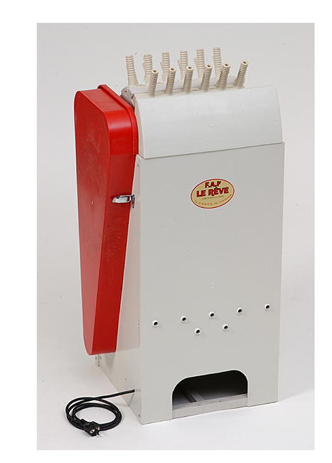 Cette plumeuse est conçue pour plumer les gallinacés (poulets, pintades, dindes,…) avec un trempage à basse température (entre 48° et 53°). Cela permet de plumer parfaitement la volaille sans endommager la peau. La plumeuse est équipée de 10 rangées de 6 doigts. Les doigts peuvent être chargés individuellement et plusieurs catégories de doigts sont adaptables sur la plumeuse. Il est alors possible de varier le nombre et/ou la dureté des doigts suivant la volaille à plumer (caille, pigeon, dindon,…). Le châssis en inox et plastique est conçu de façon à offrir une grande robustesse à la machine. La pignonerie en matière plastique auto-lubrifiante nécessite un minimum d’entretien. Nettoyage facilement au jet d’eau.